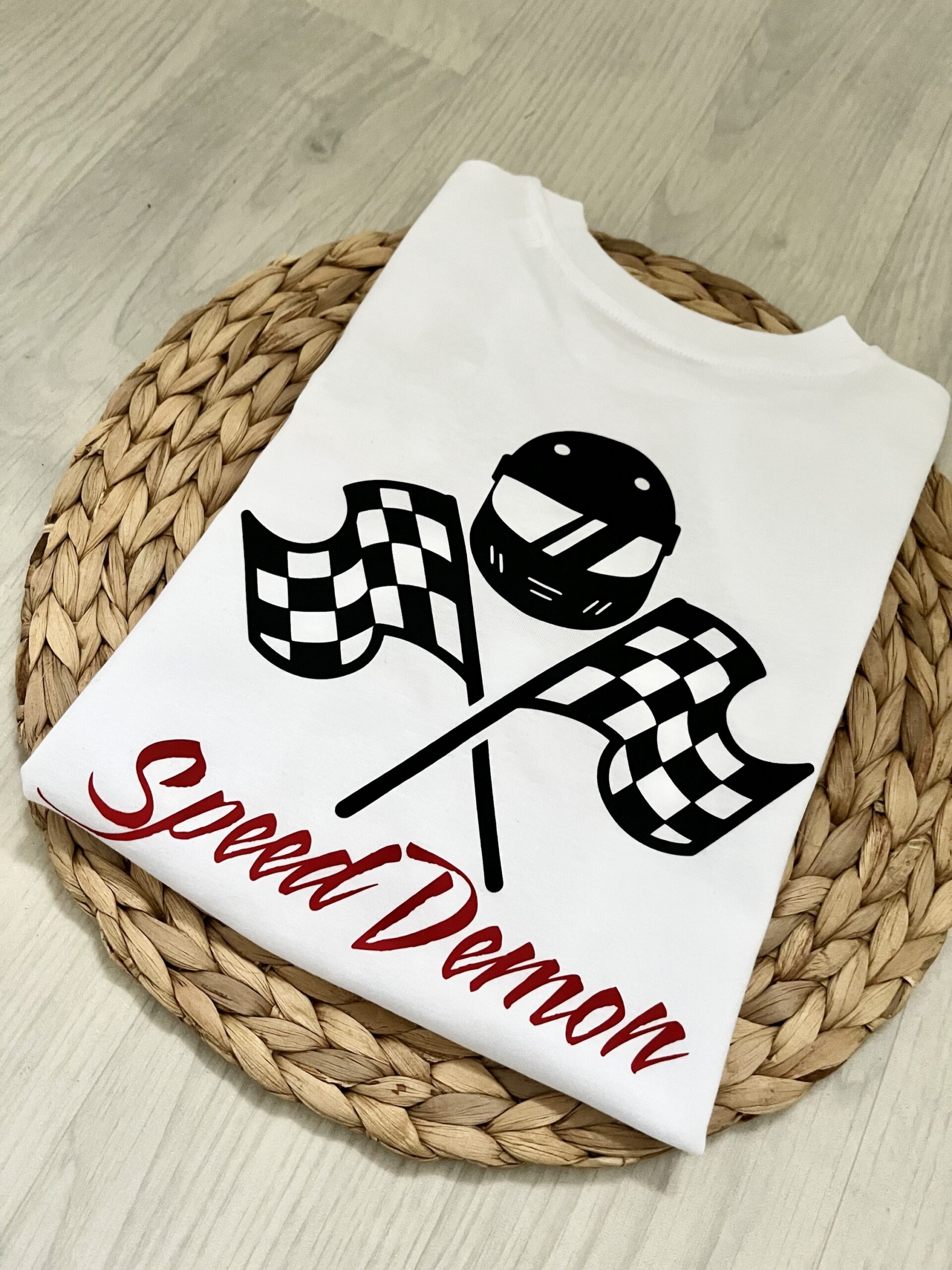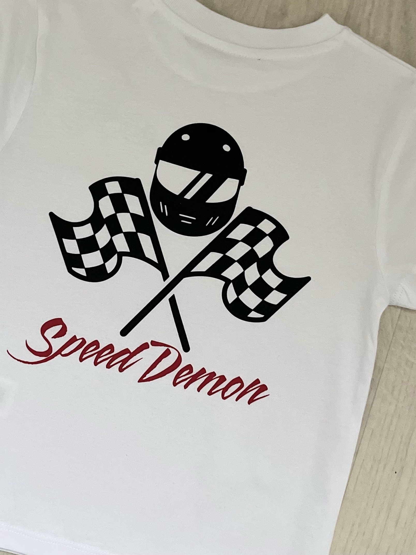 The coolest tee for the coolest kids. White tee with black and red vinyl print.