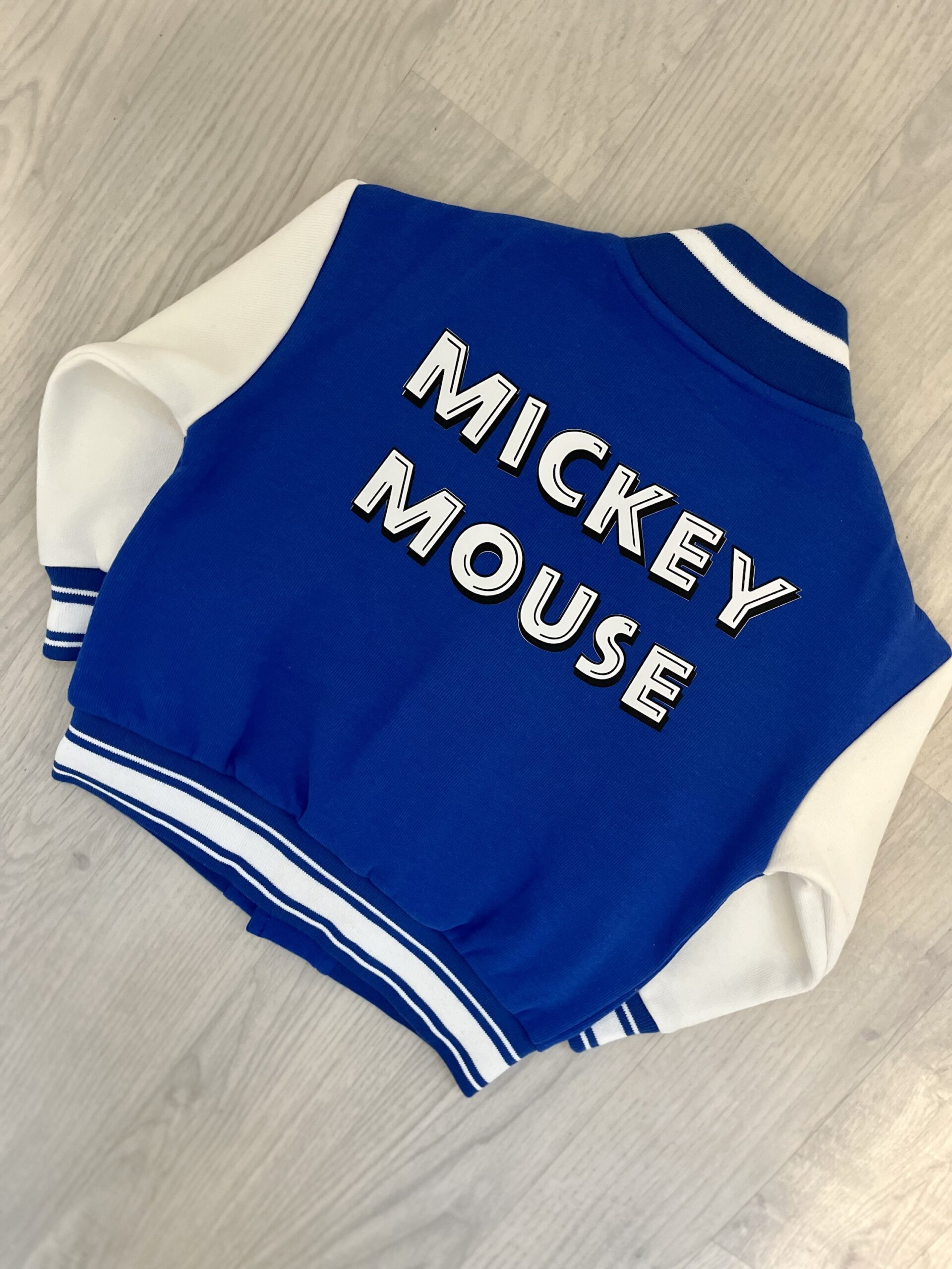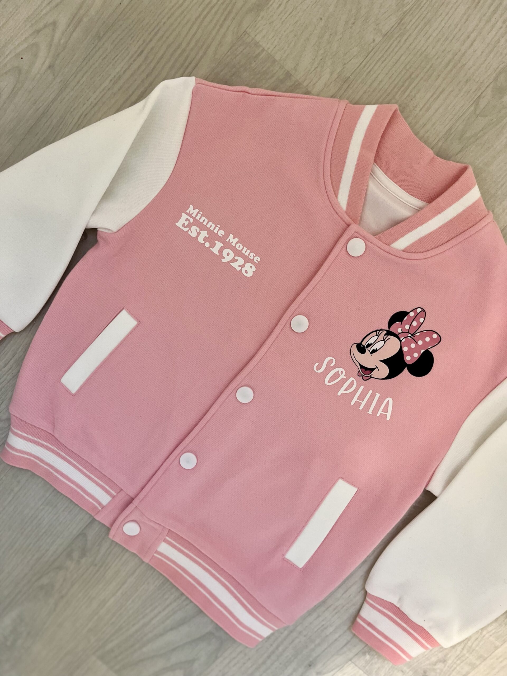 Our classic varsity jackets with a Mickey or Minnie Mouse personalised print on the front and matching text on the back.